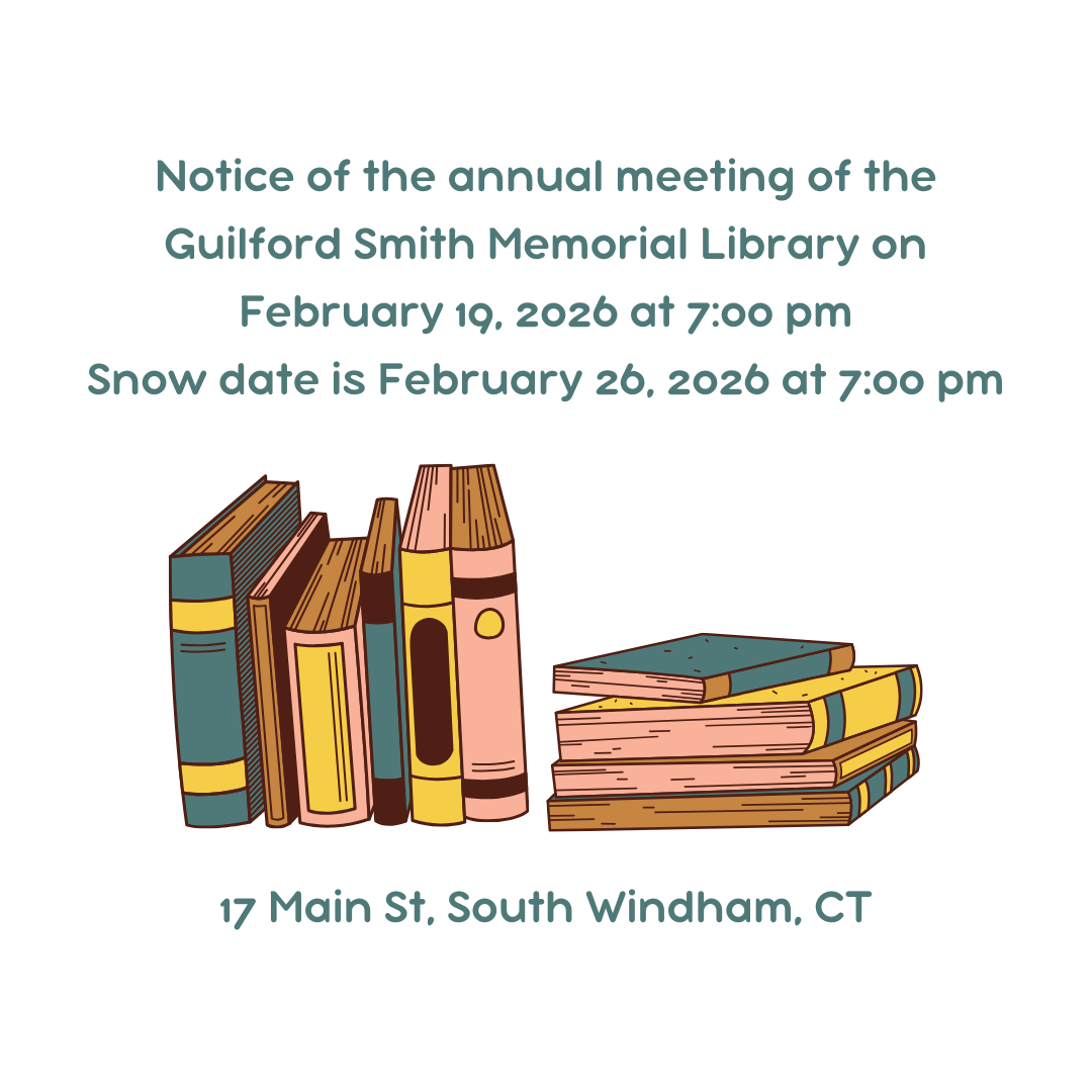 Notice of the annual meeting of the Guilford Smith Memorial Library on February 19, 2026 at 7:00 pm.