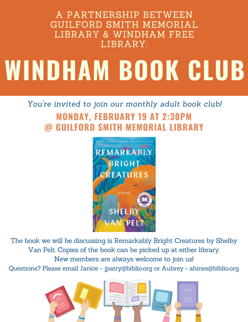 The Windham Free and Guilford Smith Memorial Libraries have joined forces to offer a monthly adult book club, conveniently named the Windham Book Club.